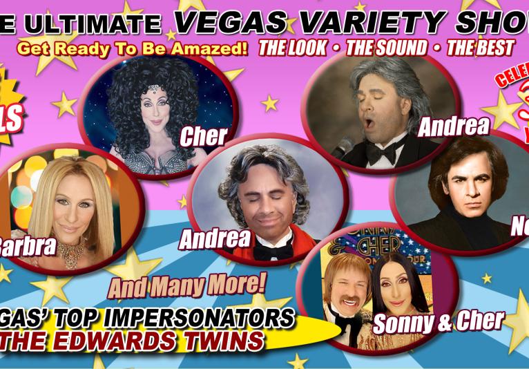 Remember all the wonderful Variety shows we all grew up on in the 70's & 80's? Now is your chance to see them live and re-created by Las Vegas' number one impersonators of all time. Anthony & Eddie Edwards use state of the art make-up to look and sound like the superstars of today and yesterday. All your favorite legendary Superstars come alive in Super Stars on Stage: The Ultimate Variety Show. The NBC Today show says "it's of the most extraordinary shows we have ever seen." Sonny & Cher, Billy Joel, Elton John, Neil Diamond, Roy Orbison, Willie Nelson, Lady Gaga, Celine Dion, Rod Stewart, Bette Midler, Olivia Newton John, Barbra Streisand, Andrea Bocelli, Frankie Valli, Tom Jones, and many many more.